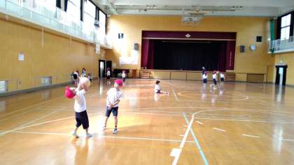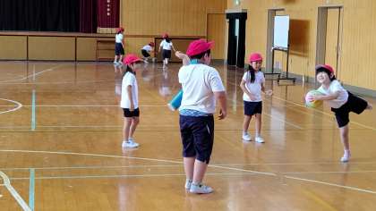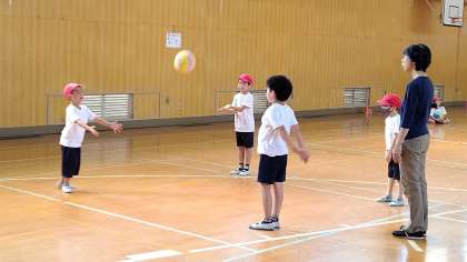 5時間目、1年生が講堂で体育の学習をしています。「ボール運動」をしています。友だちが投げたボールを受けて、何回続くか数えています。