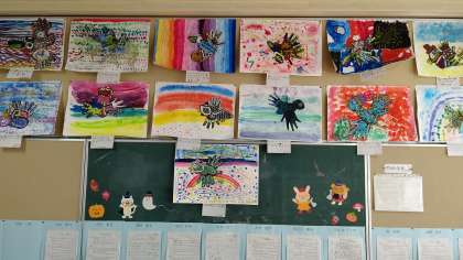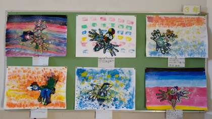 教室の後ろの掲示板と西階段掲示板に、作品が展示されています。