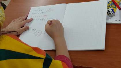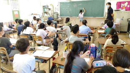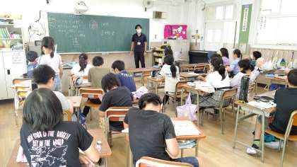 3時間目、5年生が算数の学習をしています。「45分は、何時間か」を考えています。小数と分数について学習しています。