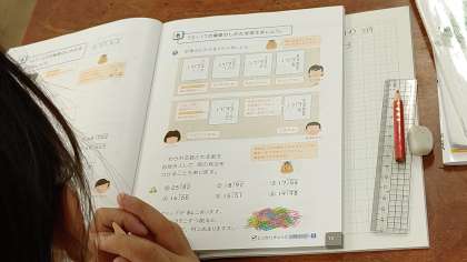 3時間目、4年生が算数の学習をしています。「63÷15の筆算をします。仮商はいくつ?」を考えています。筆算のしかたを考えています。