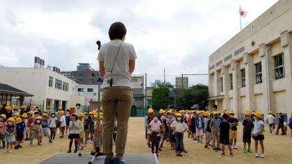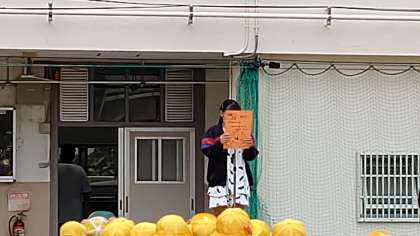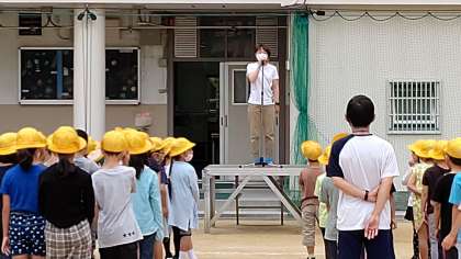 今日は、運動場で全校朝会がありました。校長先生のお話のあと、健康委員会から連絡がありました。