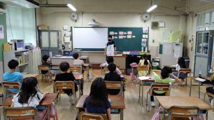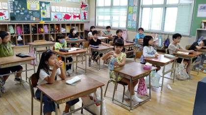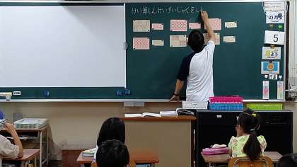 1時間目、2年生が算数の学習をしています。「計算しんけいすいじゃく」をしています。かけ算のしきを学習しています。