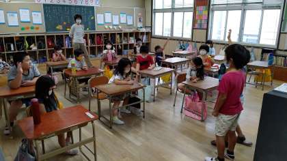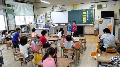 1時間目、1年生が学級活動をしています。係りの児童が前に出て、休み中のお話をしています。みんなの質問にも答えています。