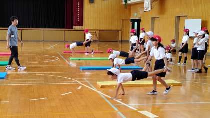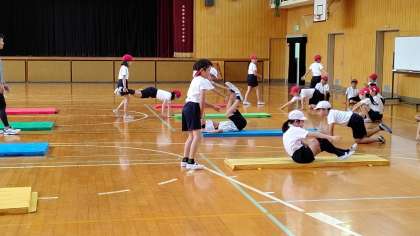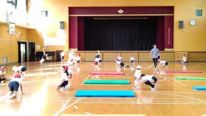 5時間目、4年生が講堂で体育の学習をしています。マット運動と跳び箱の練習をしています。