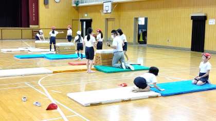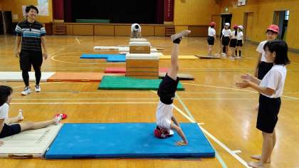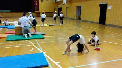 放課後、4年生の児童が、「三点倒立」「台上前転」などを練習しています。土曜公開授業で発表する準備をしています。保護者のみなさま、土曜日に子どもたちの成果をご覧ください。