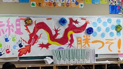 土曜公開授業の「ミニ運動会」に使う応援旗が掲示しています。