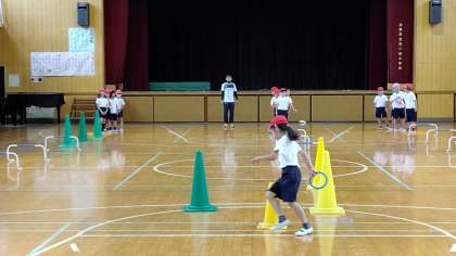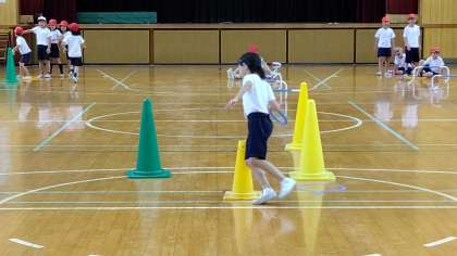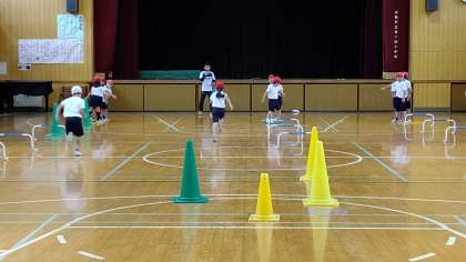 ハードルとコーンを置いて、リレーをしています。自分たちでハードルとコーンの置く位置を変えています。