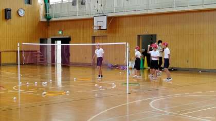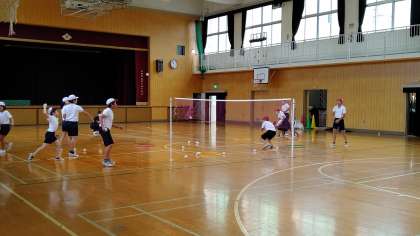 3時間目、6年生が講堂で体育の学習をしています。「ミニ体育大会」をしています。写真屋さんが、卒業アルバムの撮影をしています。今日は、今までの練習の成果を、保護者の方々に観てもらうため、みんな張りきっています。