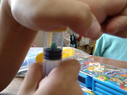 「とじこめた空気と水」の学習で、容器に圧力をかけた時に中の発泡スチロールがどのように変化するか実検しました。