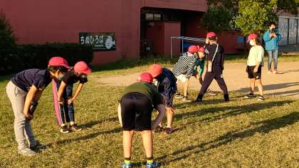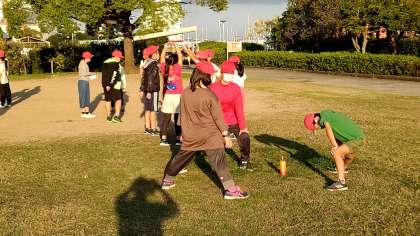 今日も晴天です。2日目が始まりました。みんな元気です。朝の集いが始まります。各グループごとに体操をしています。