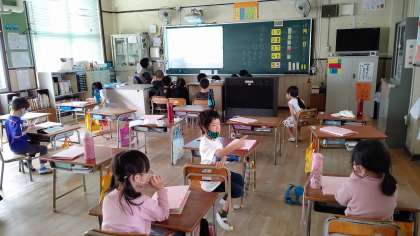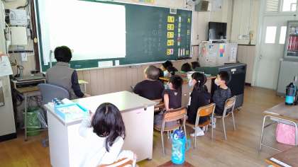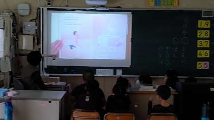 5時間目、1年生が国語の学習をしています。絵本「ぼくのおふろ」の読み聞かせをしています。