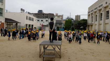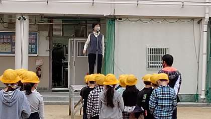 今日は、運動場で全校朝会がありました。校長先生ですお話のあと、山本敦子先生から、今月のめあて「言葉づかいに気をつけよう」についてお話がありました。