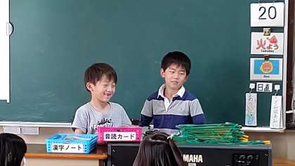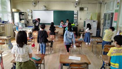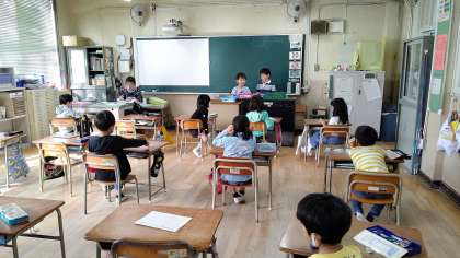 日直さんが、前に出て朝の会をしています。みんなに休み中のお話をしています。