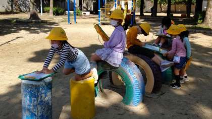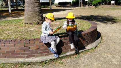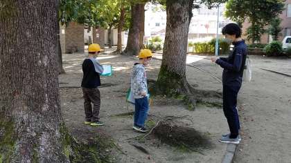 2時間目、1年生が東小橋公園を探検しています。探検のあと、公園で遊んでいます。
