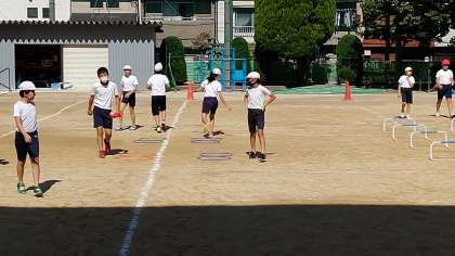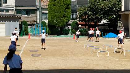 4時間目、6年生が運動場で体育の学習をしています。「ハードル走」の練習をしています。