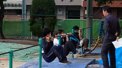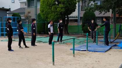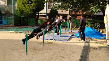 放課後、先生方が鉄棒の研修会を開いています。児童に対する指導方法を研修しています。先生方も頑張っていますよ。