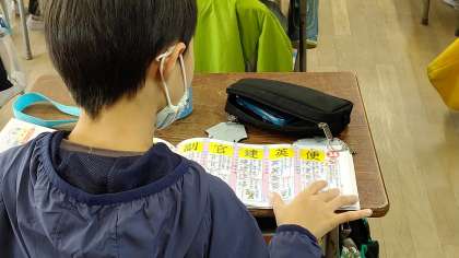 4年生が朝の学級活動で、宿題の答え合わせと自主学習をしています。