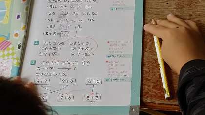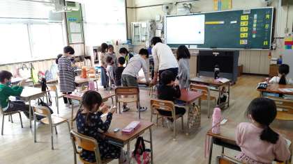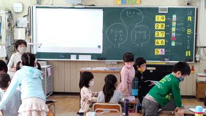 2時間目、1年生が算数の学習をしています。「たし算」の仕方を学習しています。