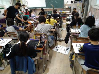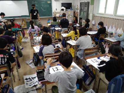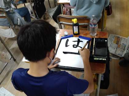 今日の題材は「はす」でした。ひらがなは画数が少ないですが、一直線でない部分が多く、丸く書く部分は微妙に形が違います。手本をよく見てがんばって書いていました。