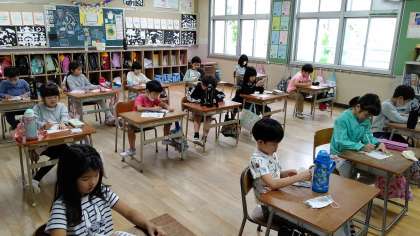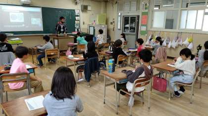1時間目、2年生が算数の学習をしています。「かけ算」の宿題の答えて合わせをしています。