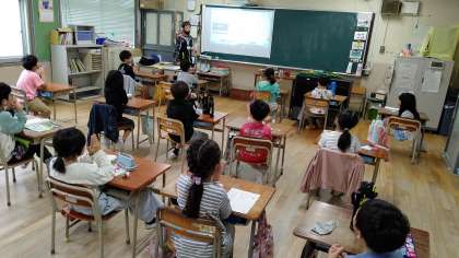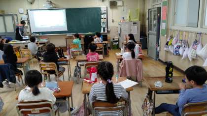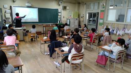 2時間目、2年生が音楽の学習をしています。リズムに合わせて、楽器を演奏しています。