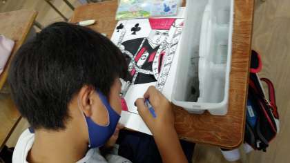 5時間目、6年生が図工の学習をしています。「トランプの絵札」を模写しています。
