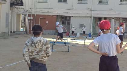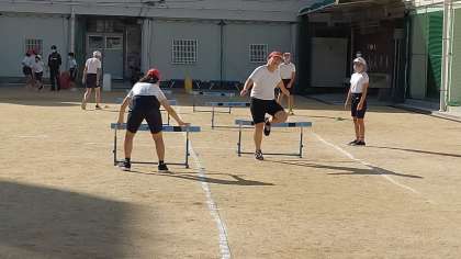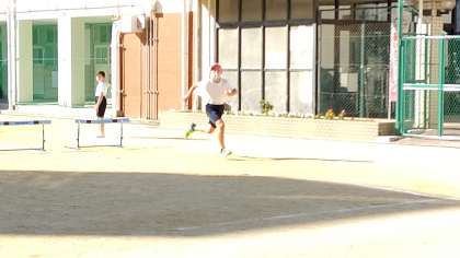 1時間目、6年生が運動場で体育の学習をしています。「ハードル走」を練習しています。