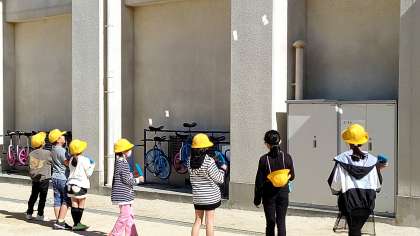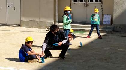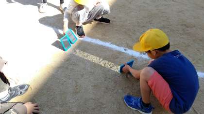 4時間目、3年生が運動場で「光りの反射」の実験をしています。