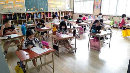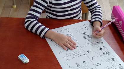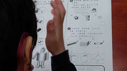 テストの説明を聞いてから、「かたちあそび」のテストをしています。