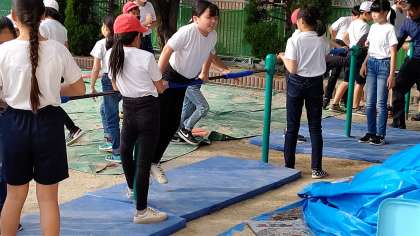 6時間目、5年生が運動場で体育の学習をしています。「逆上がり・前回り降り」を練習しています。