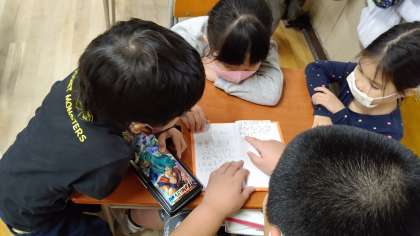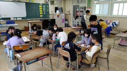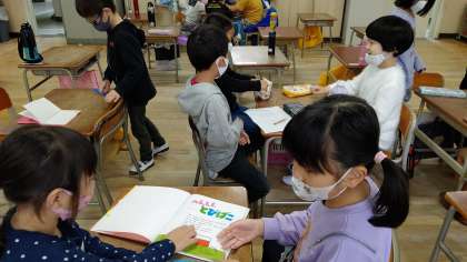 1時間目、1年生が学級活動をしています。みんなで話しあいをしています。