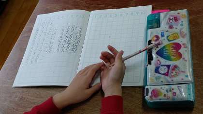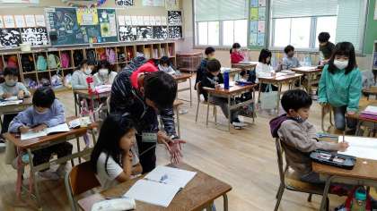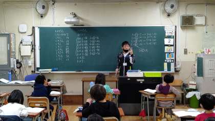 1時間目、2年生が算数の学習をしています。「七のだん、八のだんのかけ算」を練習しています。