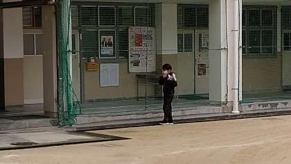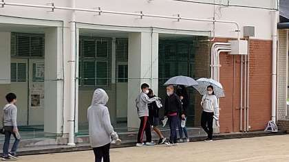 今日は雨天のため、外国語の授業がある多目的室に行くのに、雨に濡れながら移動しています。