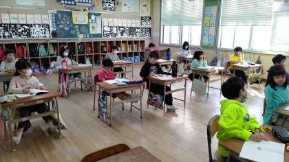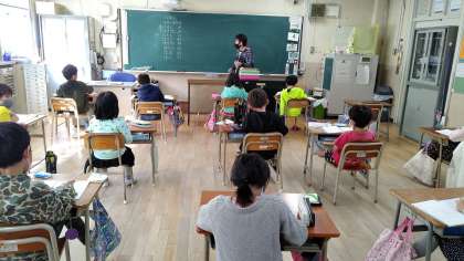 1時間目、2年生が算数の学習をしています。「八のだんのかけ算」を暗唱しています。