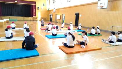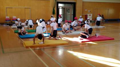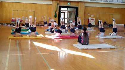 2時間目、6年生が講堂で体育の学習をしています。「跳び箱」につながる動きを練習しています。