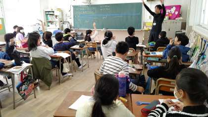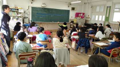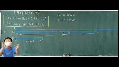 2時間目、5年生が算数の学習をしています。「2人に3mの紙テープを渡します。4分の3mを、前にもってきましょう」という問題を考えています。
