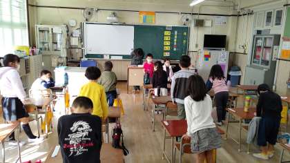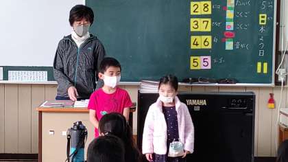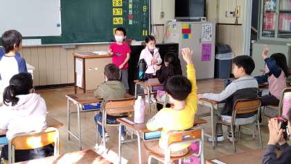 日直さんが、前に出てお話をしています。みんなの質問に答えています。