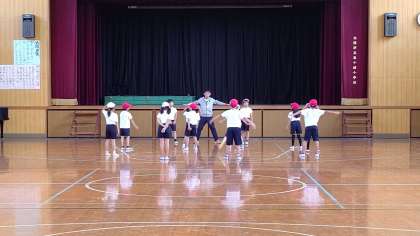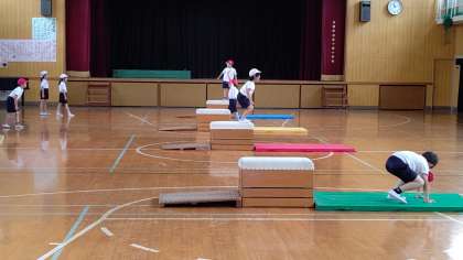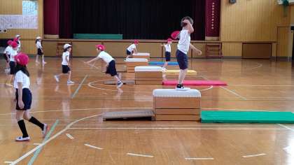 3時間目、2年生が講堂で体育の学習をしています。「跳び箱」の練習をしています。