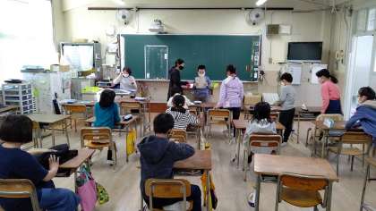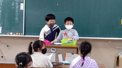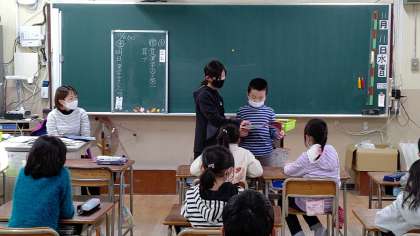 3年生が、朝の会をしています。係りの児童が前に出て、宿題の答えあわせをしています。そのあと、日直さんが、前に出て進めています。