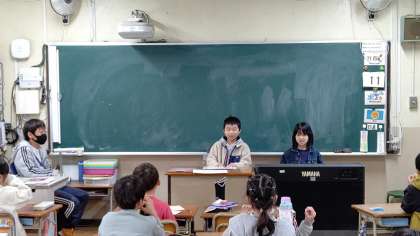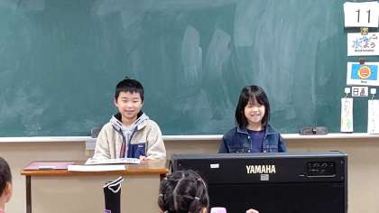 日直さんが前に出て、朝の会をしています。日直さんが、お話をしています。