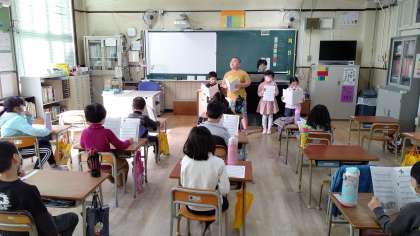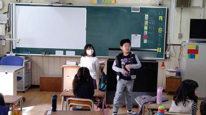 日直さんが前に出て、朝の会をしています。そのあと、音楽係りの児童が前に出て、「にじ」を歌っています。