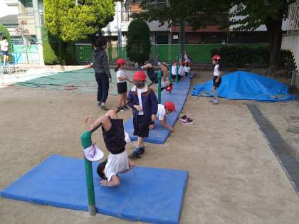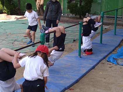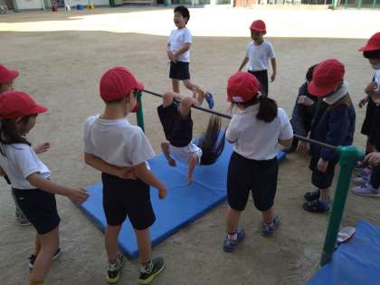鉄棒遊びの学習の様子です。少しずつできる技も増えてきました。2人でコウモリじゃんけんなどをして楽しんでいました。