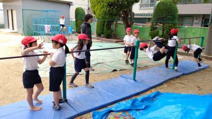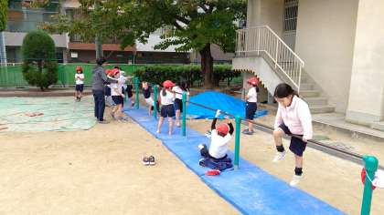 2時間目、1年生が運動場で体育の学習をしています。「鉄棒」の練習をしています。