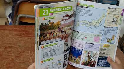 3時間目、6年生が社会科の学習をしています。「明治維新」の学習をしています。幕末から明治への激動の時代を学習しています。