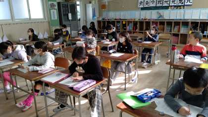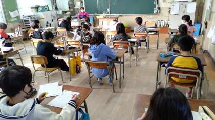 3年生が、朝の学習で「算数とアルファベット」を学習しています。