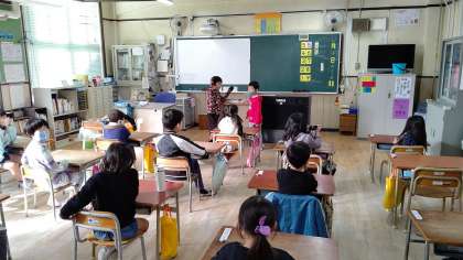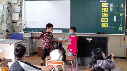 1年生が、朝の会で日直さんが、前に出て、お話をしています。