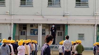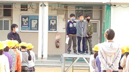 今日は、運動場で全校朝会がありました。校長先生のお話、代表委員会から明日からはじまる「共同募金」の連絡、木下先生から今月の目標についてお話がありました。