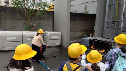 消火器の使って消火訓練をしています。そのあと、消防車についてお話を聞いています。