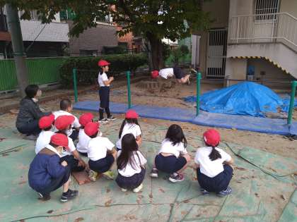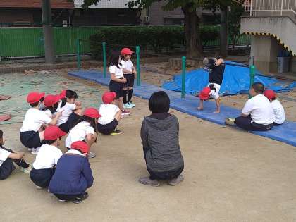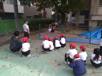 運動場で、鉄棒遊びをしました。学習の後半は、できるようになったことを発表しました。