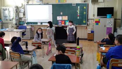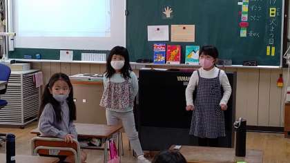 1年生が、朝の会をしています。日直さんが前に出て、お話をしています。